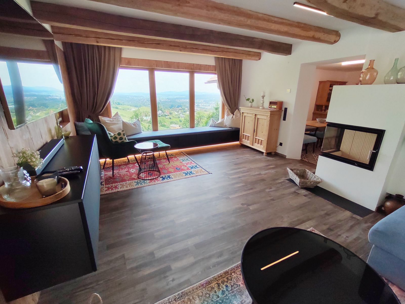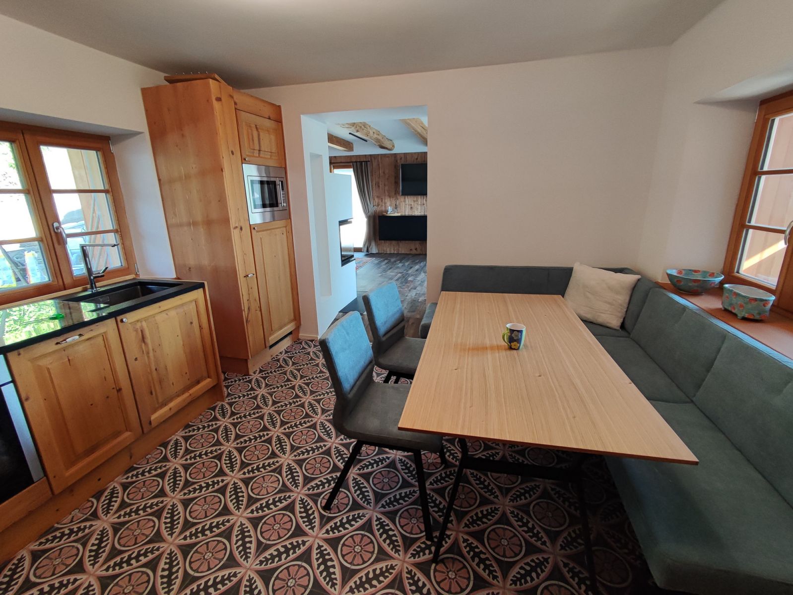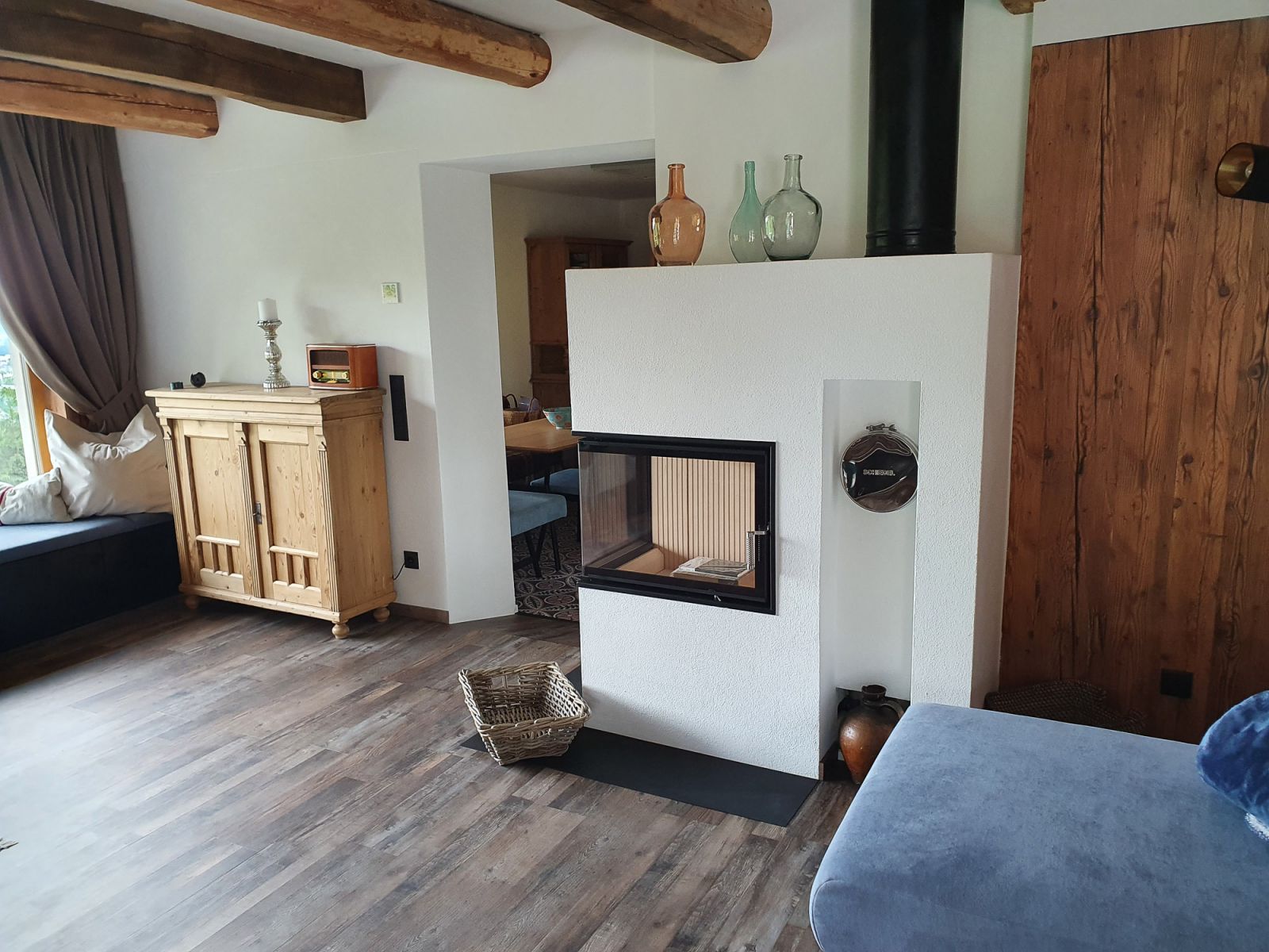 - Altholzoberflächen versprühen Gemütlichkeit, modernes Design kombiniert mit geschichtsträchtigen Möbeln, ein Kachelofen, gemütliche Sitzarrangements, eine ausziehbare Couch im Wohnzimmer, die bei Bedarf noch Platz für einen weiteren Gast bietet.