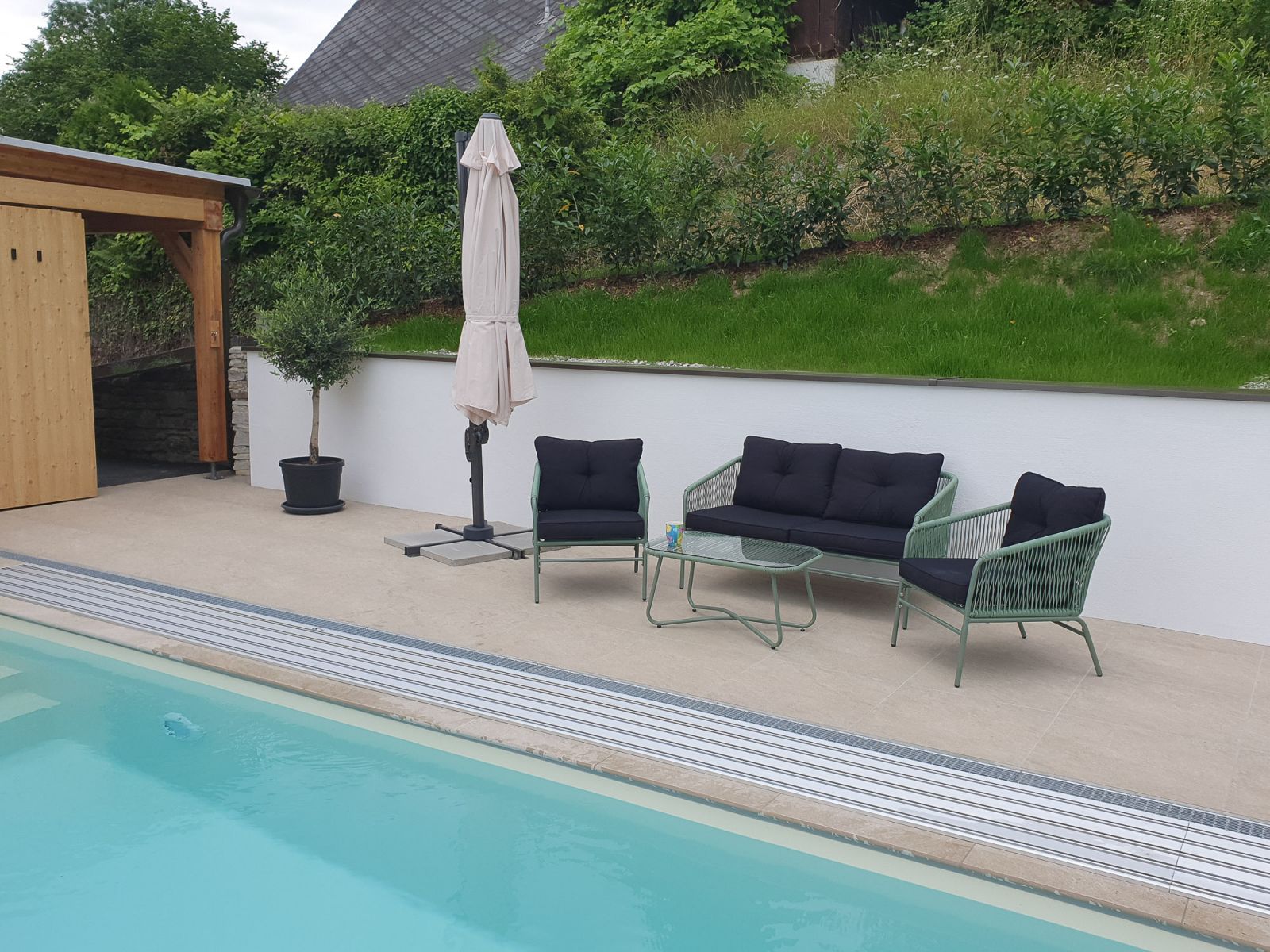 - Ein 12 m langer Swimmingpool, der bis Ende Oktober verfügbar ist.